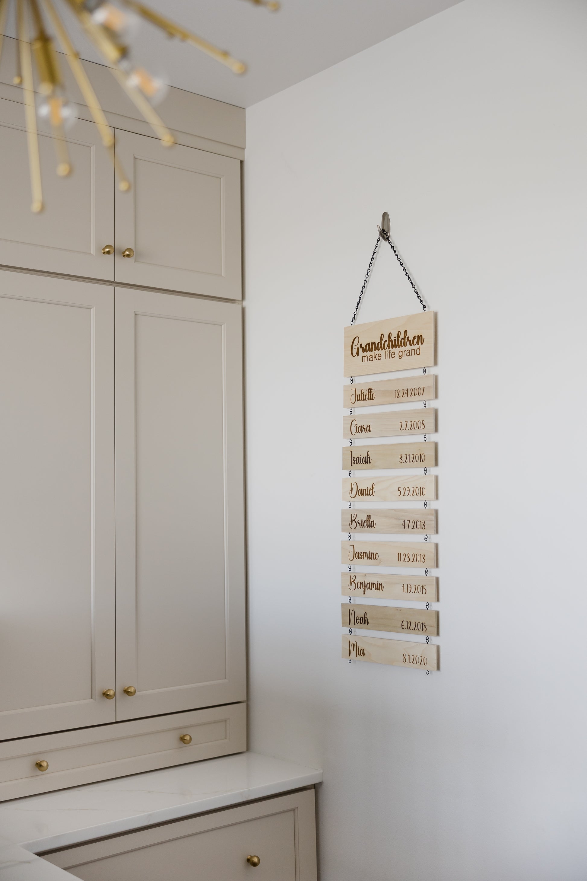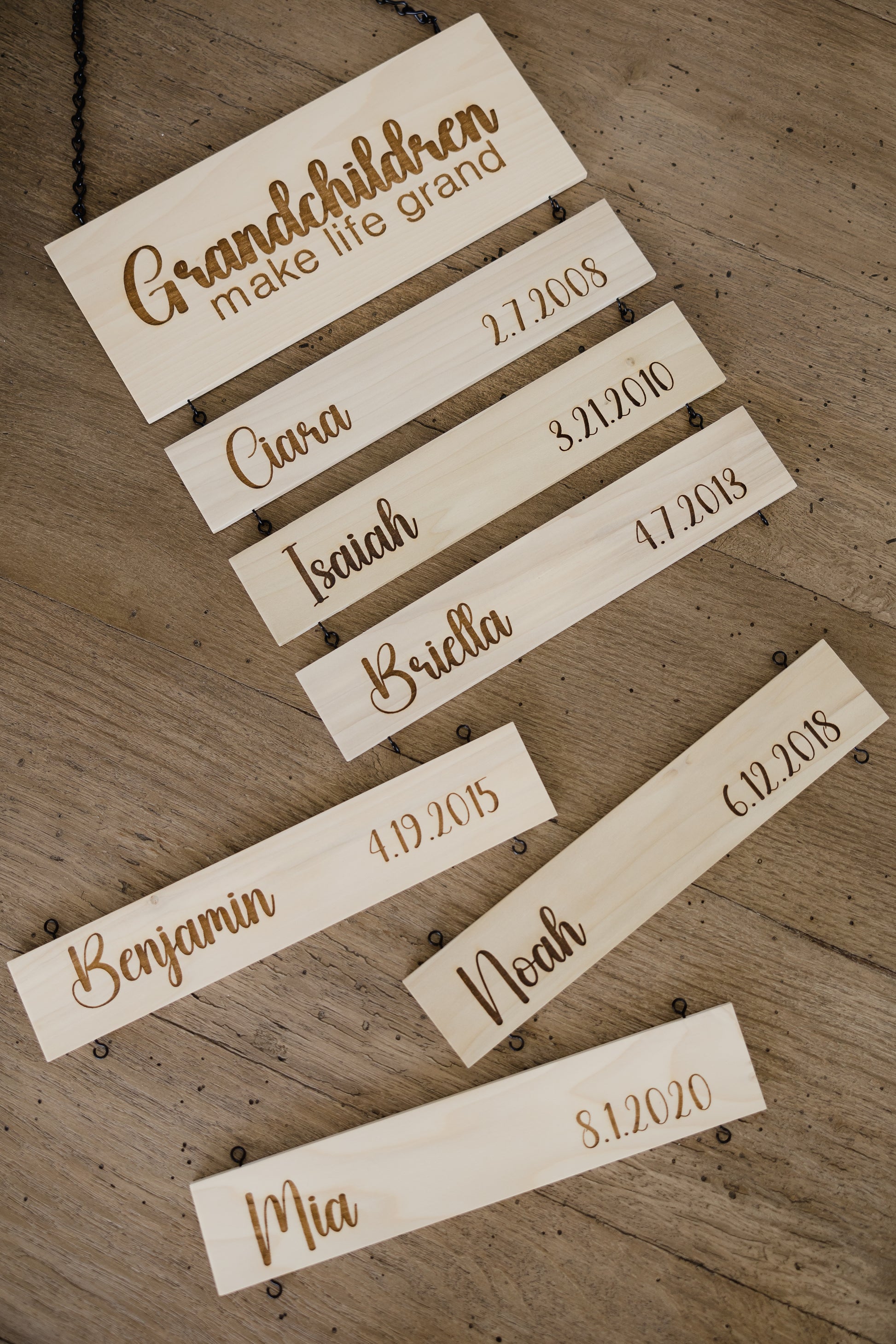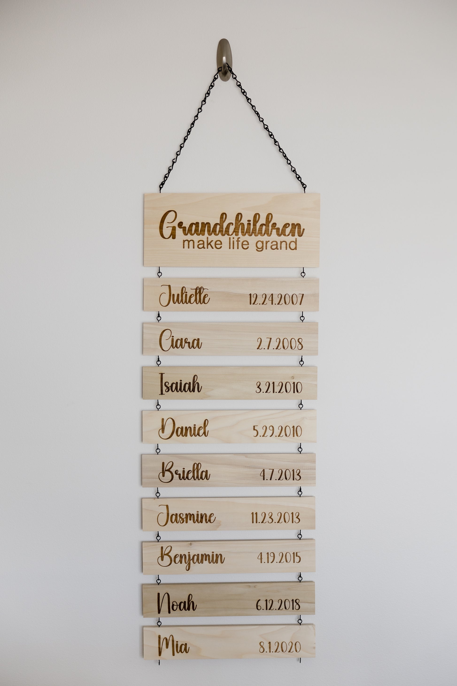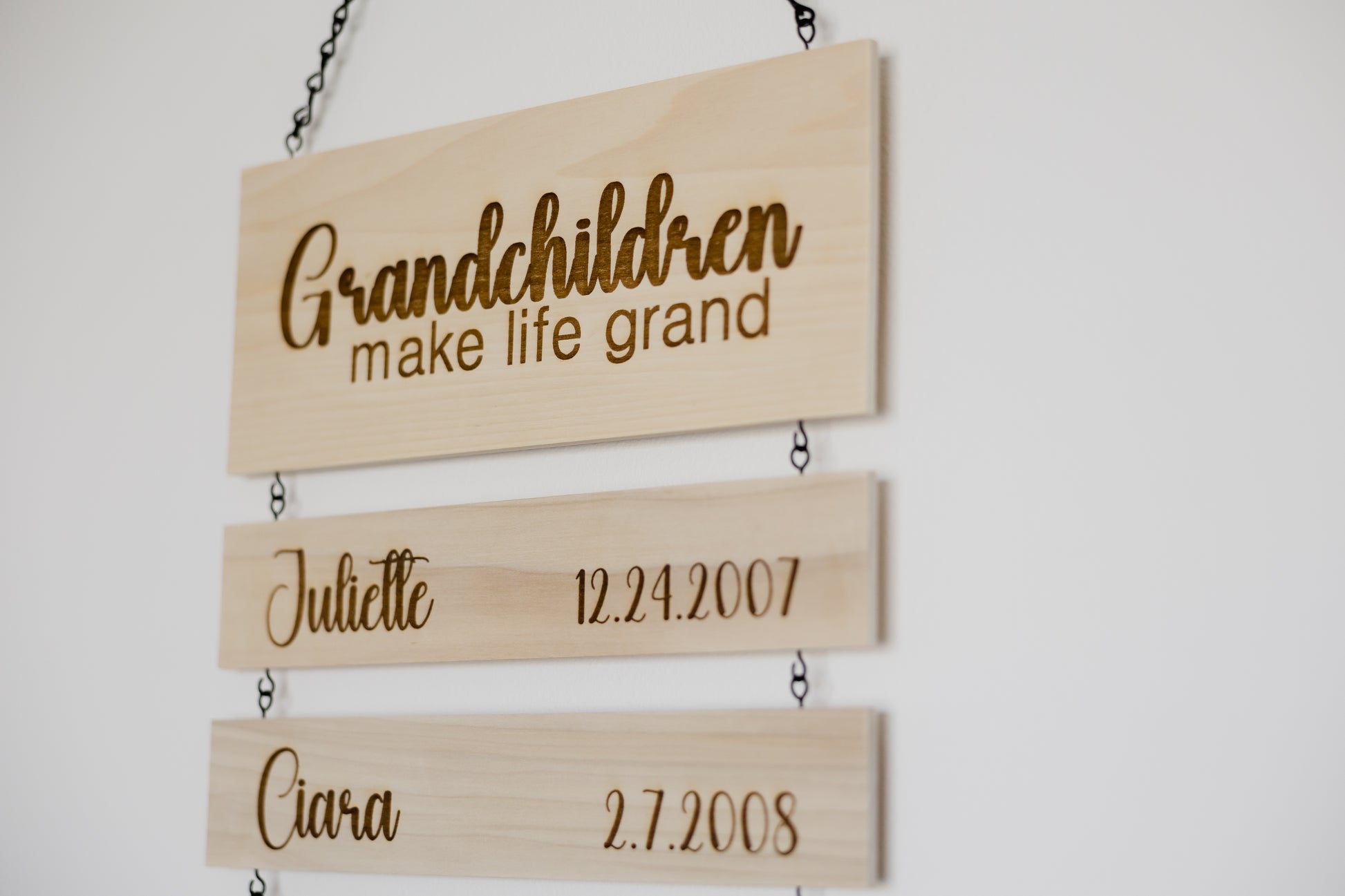 Featuring the heartfelt message "Grandchildren make life grand", this sign is the perfect gift for those special grandparents in your life. Each sign comes with individual name slats, allowing you to personalize it with up to 20 names and birthdays. If you need more names, reach out to us via email or chat.