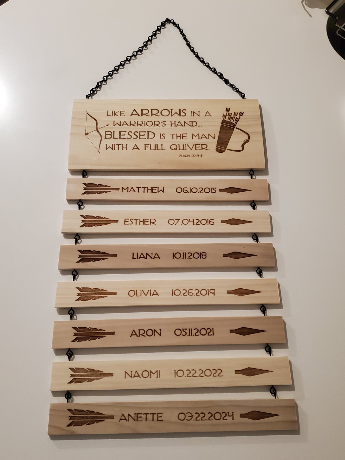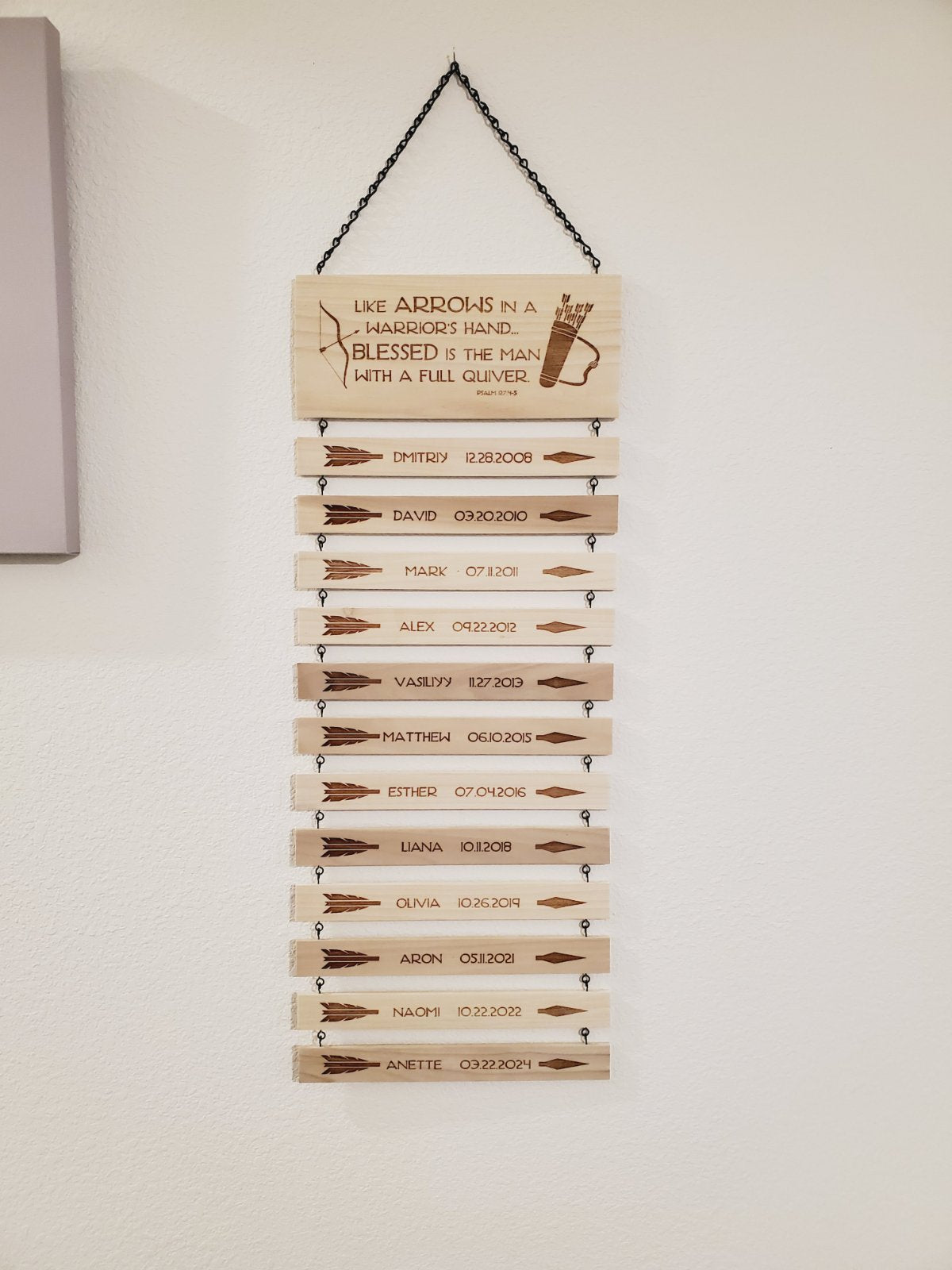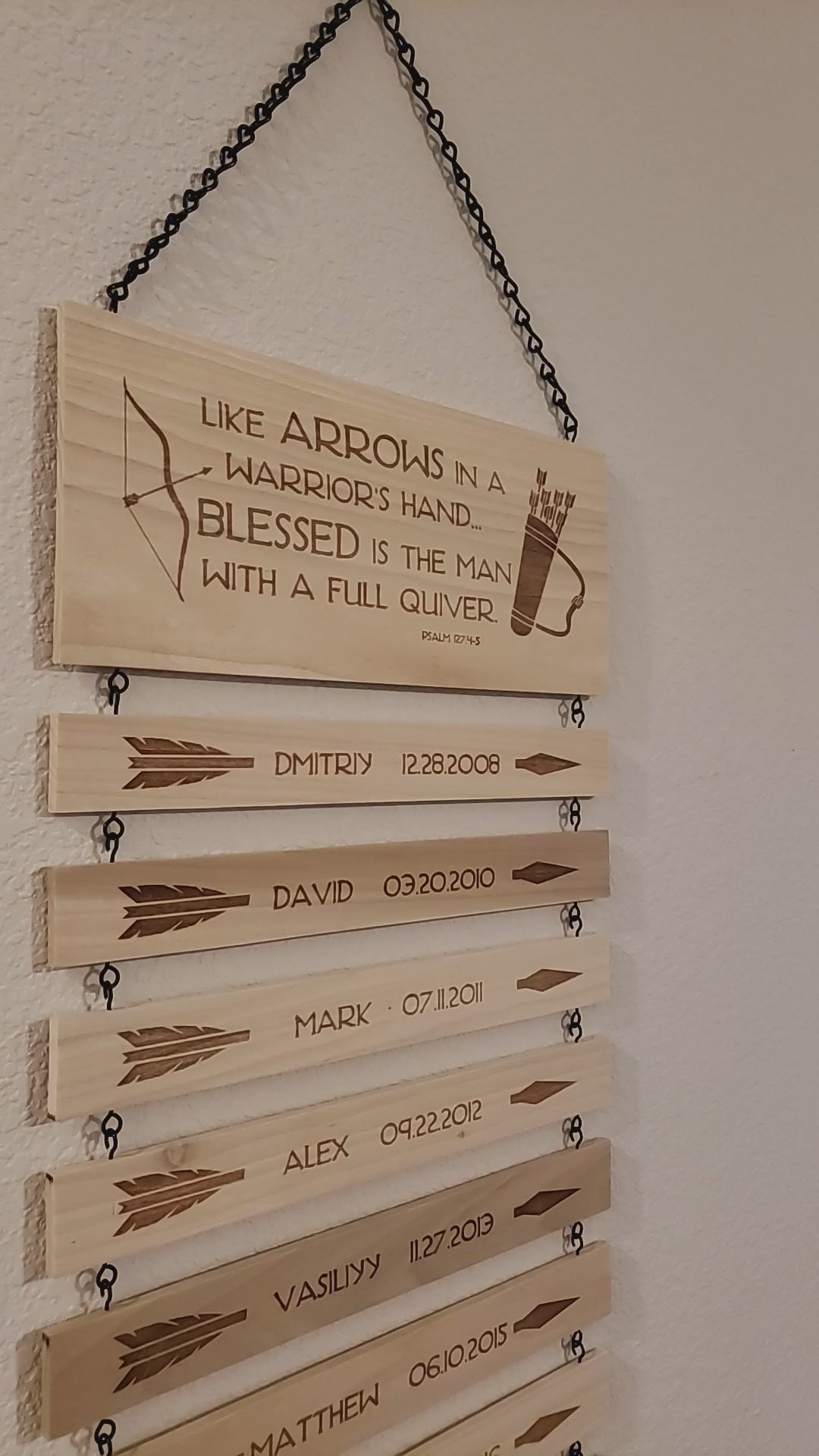 The main sign proudly displays the heartfelt message: "Like arrows in a warrior's hand, blessed is the man with a full quiver." Below this, individual plaques hang with the names and birthdays of each child, making it a truly personalized and meaningful addition to any room.
