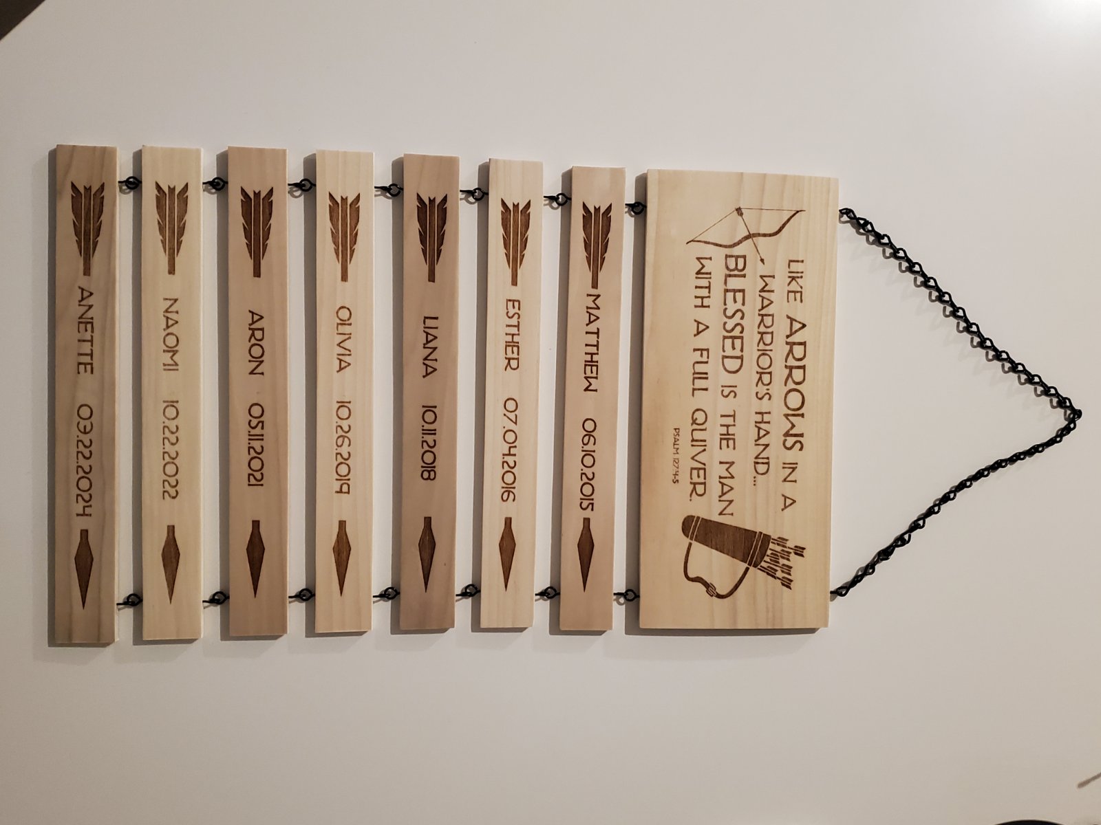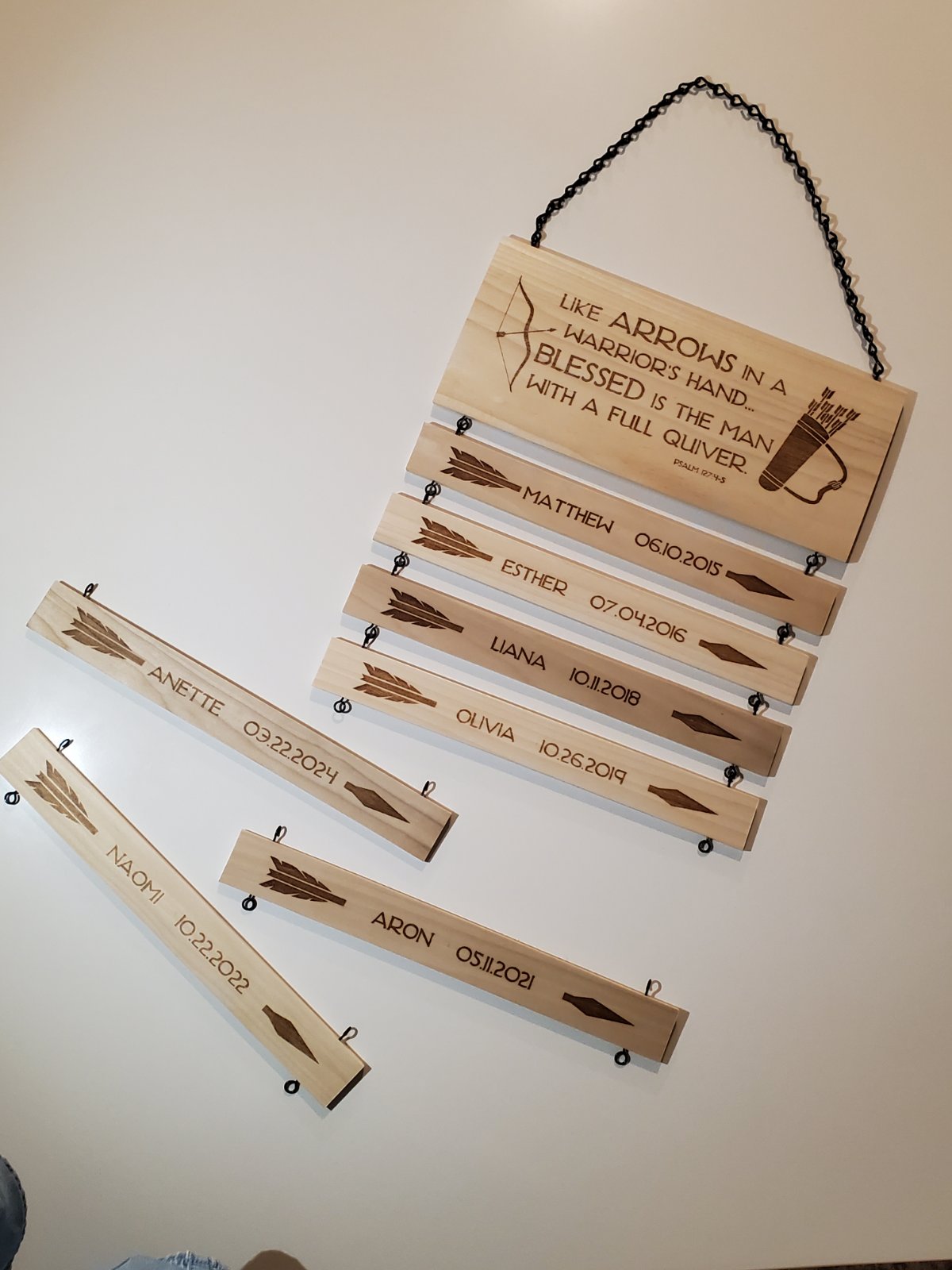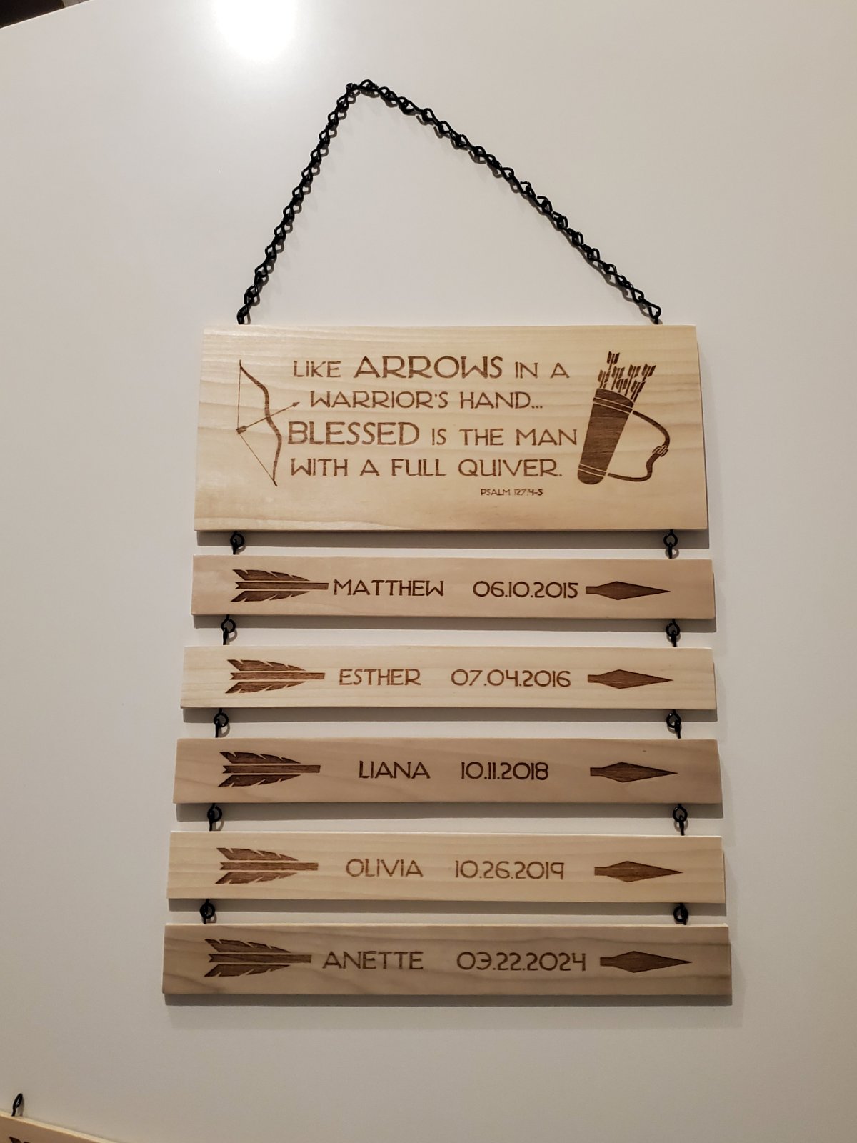 The main sign proudly displays the heartfelt message: "Like arrows in a warrior's hand, blessed is the man with a full quiver." Below this, individual plaques hang with the names and birthdays of each child, making it a truly personalized and meaningful addition to any room.