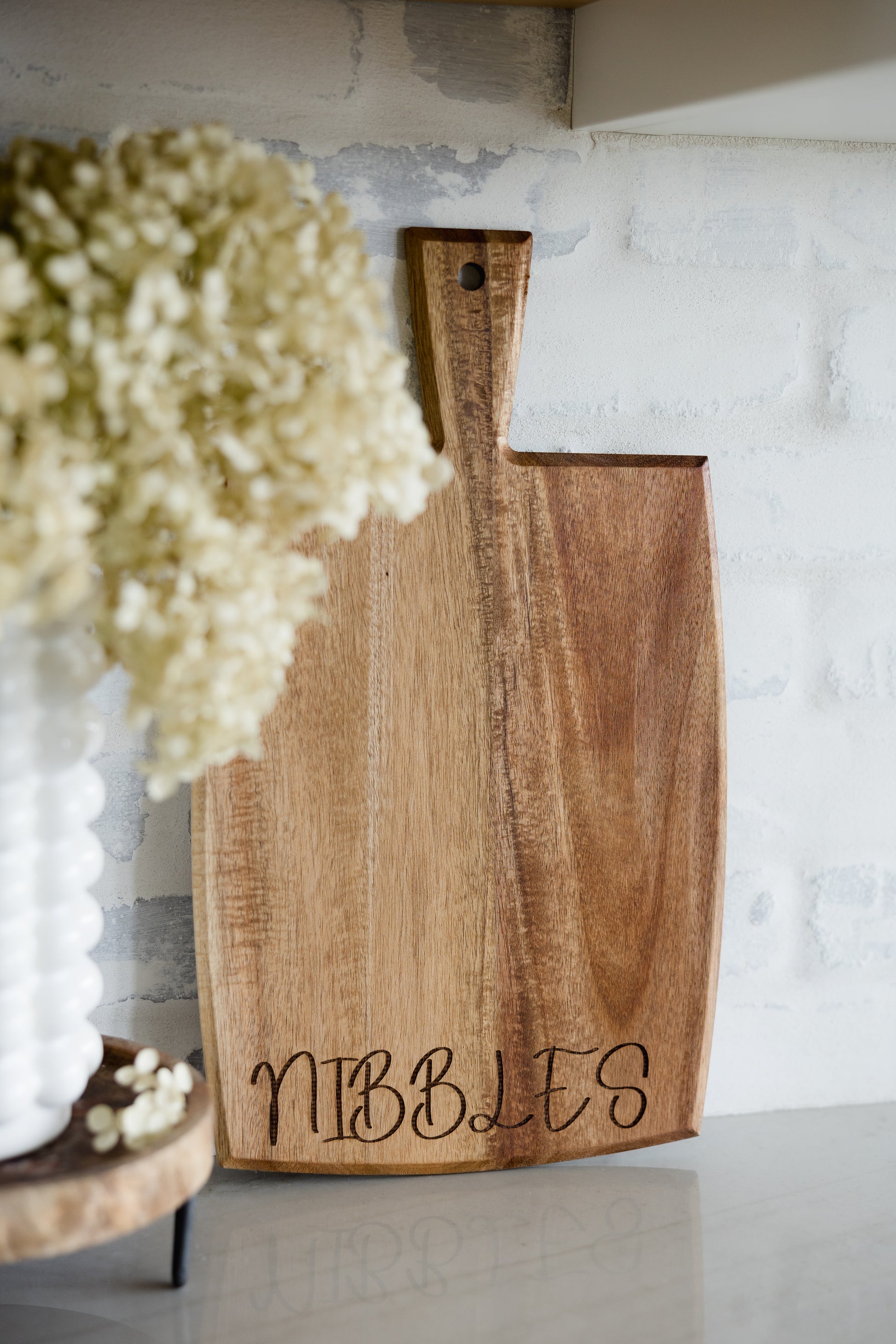 As a special touch, each board comes engraved with the word "Nibbles" at the bottom, adding a charming accent to your kitchen decor. Whether you're treating yourself or looking for the perfect gift for a friend or loved one, our Acacia Wood Cutting Board is sure to impress. Upgrade your kitchen today and experience the difference for yourself!